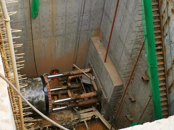 施工現(xiàn)場機(jī)器轟鳴,說話需要提高分貝。一進(jìn)入施工現(xiàn)場,就看到前方有一個沉井,沉井20米深、13.4*7.3米間方,這個沉井是挖掘井,在河的對岸還有一個深15.5米的接收井。從沉井圍欄邊看井底,下邊的工作人員都顯得特別的渺小,20米深的井相當(dāng)于6層樓高,恐高的人都不敢往下看。