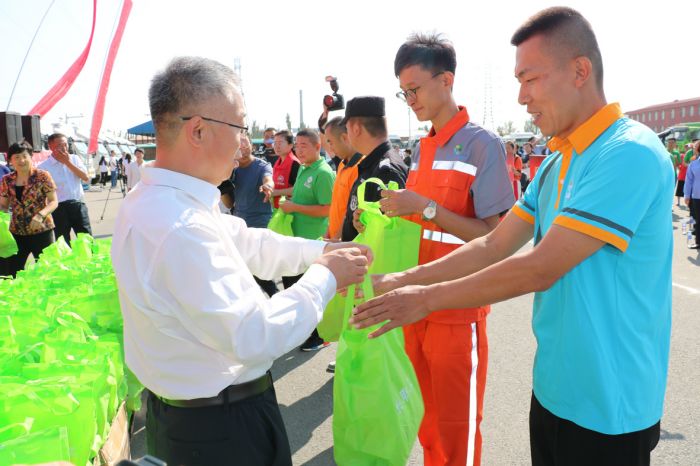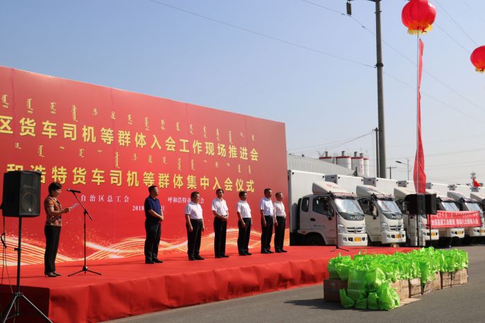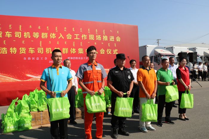 在場的各位領導、貨車司機等工作人員共同聽取了自治區(qū)總工會關于貨運司機等群體的入會報告后,激情昂揚的宣讀了入會誓詞。自治區(qū)、呼市兩級總工會的各位領導向與會的各單位頒發(fā)了工會會員證,并向入會貨車司機發(fā)放了慰問品。
