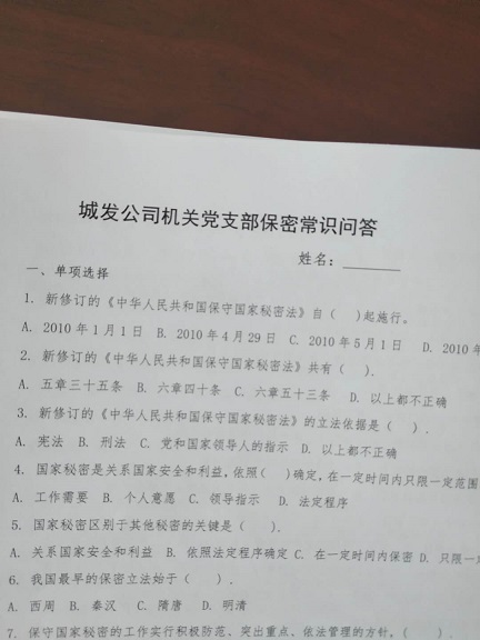 還集中進(jìn)行了保密教育。為進(jìn)一步推動保密和密碼工作現(xiàn)行方針、政策、法律法規(guī)學(xué)習(xí)宣傳活動,增強(qiáng)廣大黨員干部群眾的保密意識、保密法制觀念和強(qiáng)化密碼法的學(xué)習(xí)宣傳,黨支部通過發(fā)放解答“城發(fā)公司機(jī)關(guān)黨支部保密常識問答”100題的考卷,進(jìn)行了“忠誠干凈、踐行使命,法在心中、法在行中”為主題的《保密法》《密碼法》宣傳教育。